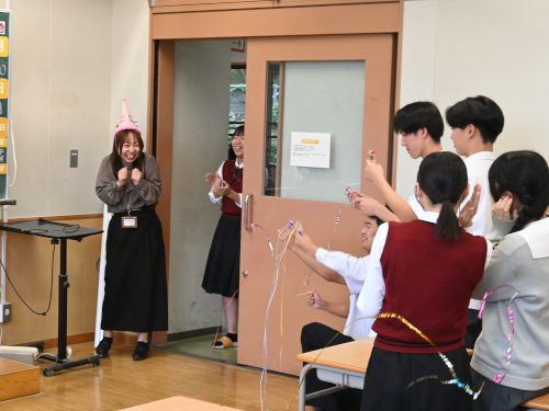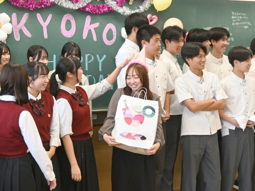 担任の尼崎先生の誕生日だということで、クラスの生徒たちが朝のホームルーム前にお祝いを企画しました。