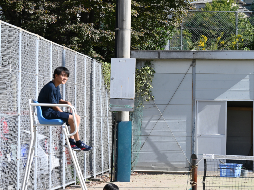 コート横の椅子で審判をしている生徒。