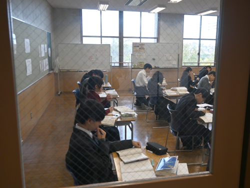 こうした考査期間に入ると、九国生たちは職員室への入室ができなくなります。用があったら入口で教員を呼んでください。