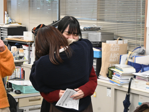 大学合格を知って担任と喜び合う先輩。