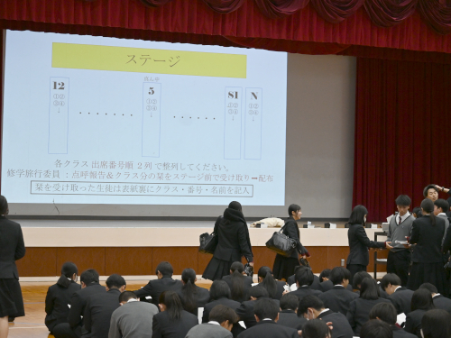修学旅行のしおりを配って、旅程の確認です。