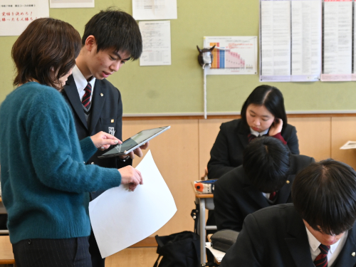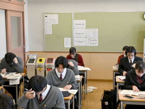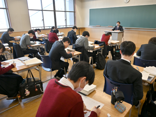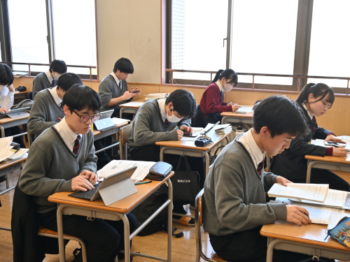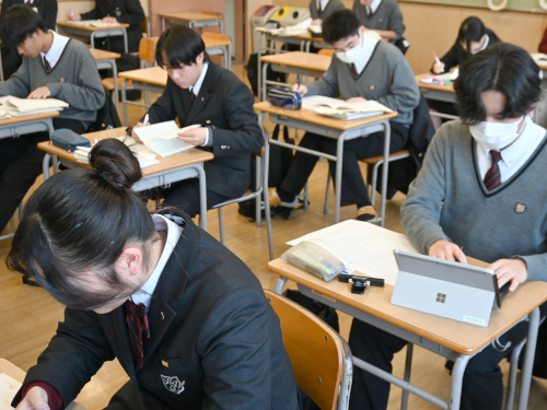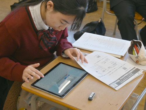 模範解答と入力用紙を受け取った生徒たちは、持ち帰ってきた問題冊子を見ながら、メモした答えを採点します。