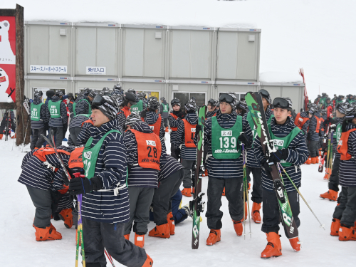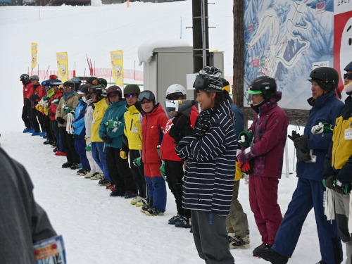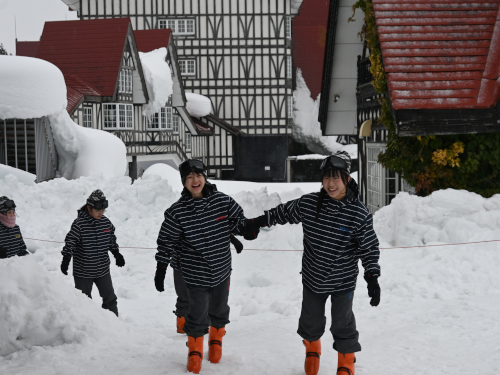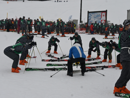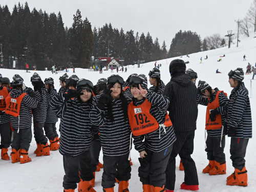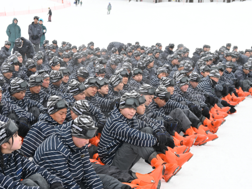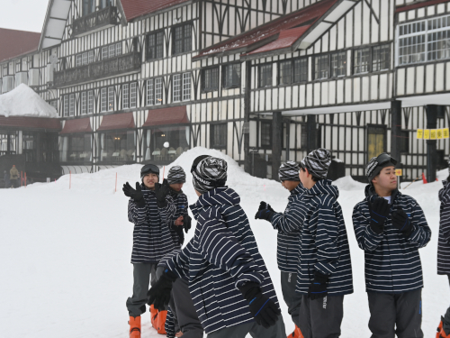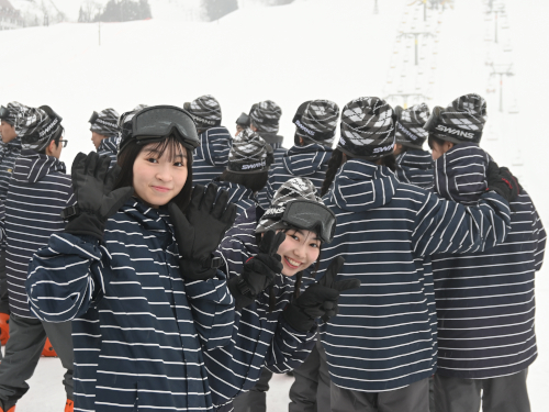 朝食をすませた生徒たちはスキーウェアに着替えてゲレンデへ。クラス単位で記念撮影をしたらさっそくスキー研修です。