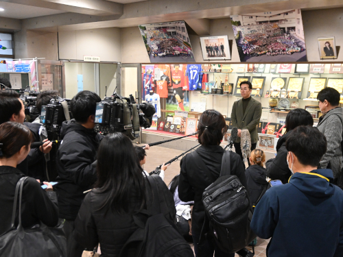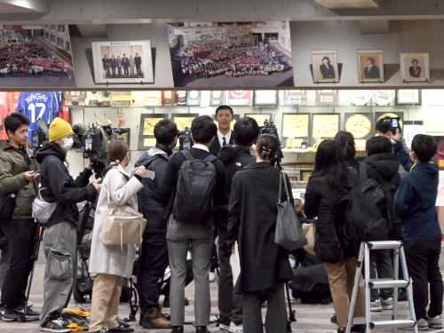 壮行会後、取材を受けていた楠城祐介監督。