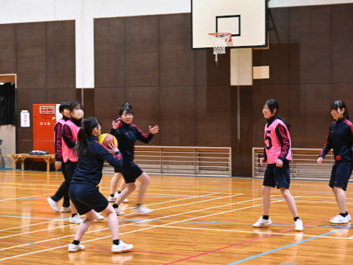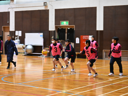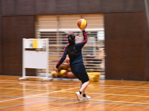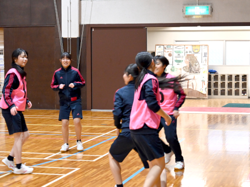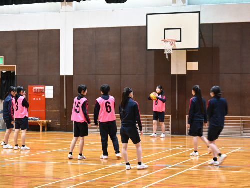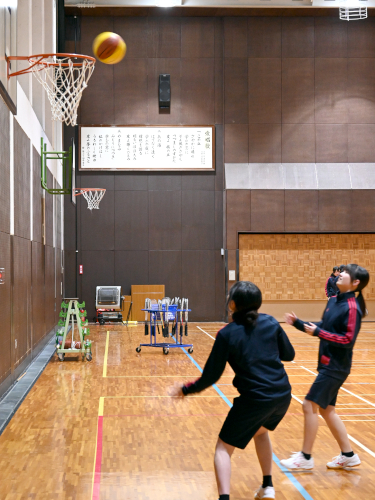 今日の写真はそのうちの第2体育館で撮った体育の授業。1年生の女子がバスケットボールを試合形式で学んでいました。