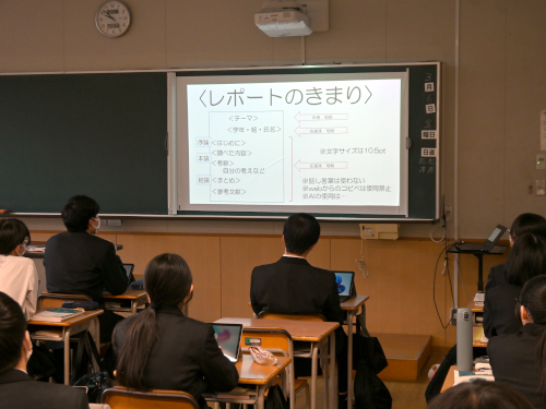 阪本先生がレポートの書き方を解説中。
