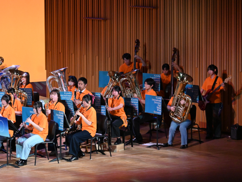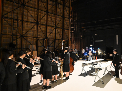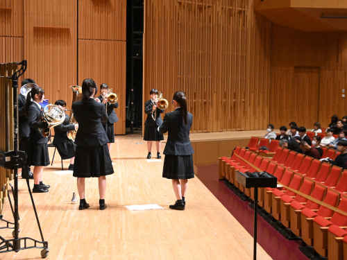 舞台裏で出演を待っている吹奏楽部員。