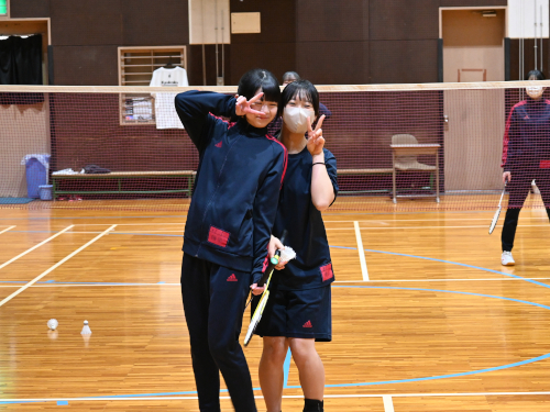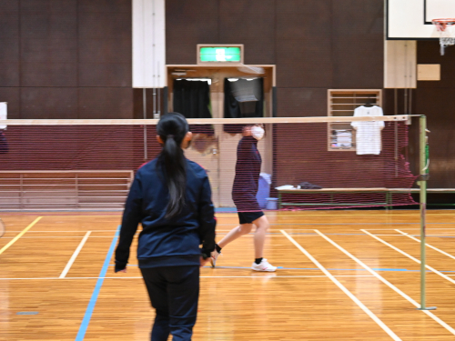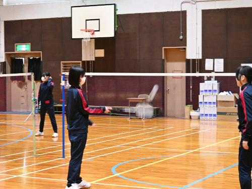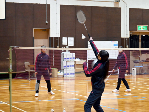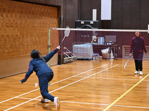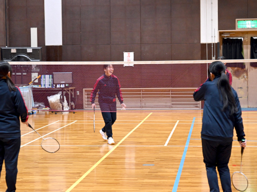 写真は体育の授業。体操服のラインが赤なので、1年生(新2年生)です。バドミントンをしているところでした。