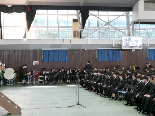 第二は、謙虚にそして素直に学ぶということです。皆さんが、知徳体のバランスが取れた人となるための学びの場は、授業だけではなく、部活動や生徒会活動、学校行事など学校生活のすべてです。本校の教育目標である「平和で民主的な社会の形成者として必要な資質を備えた、知・徳・体のバランスがとれた生徒」に成長するために、皆さんには四つの「ONE」を意識してほしいと思います。四つの「ONE」とは、「ナンバーワン」地域の信頼と期待に応えるナンバーワンを目指す、「オンリーワン」かけがえのない一人一人の輝く未来を見つける、「エブリィワン」一人一人の持つ魅力を原動力として学校の活性化に生かす、「プラスワン」今の自分に何かを加えていく日々の小さな成長を大切にする、という四つの視点です。高校時代には楽しいことばかりではなく、苦しくつらい経験もつきものですが、常に将来の本舞台を目指してのものだと考えれば、自己の成長につながる貴重な経験になります。謙虚に素直な心を忘れず、何事も最後までやり抜いてください。