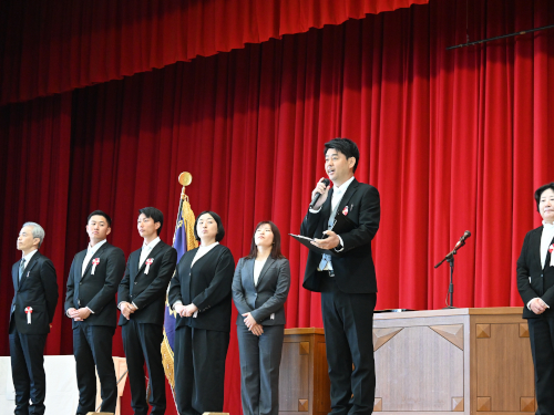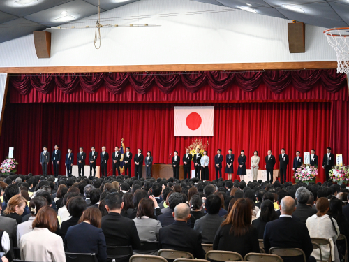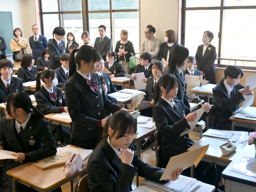 入学式のあと、生徒会が校歌と愛唱歌を紹介。