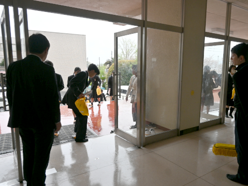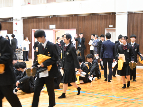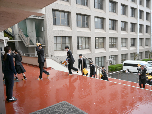 その日はあいにくの雨で場所移動が大変そうでした。第1体育館は体育の授業でもよく使います。