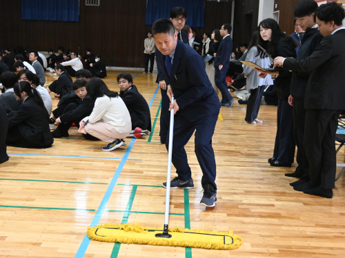 おまけ。生徒が滑らないよう水気を吹く仲西先生。